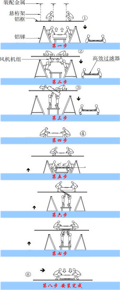 兩位工作人員扶著鋁梯,把FFU風(fēng)機(jī)機(jī)組抬上天花板去,F(xiàn)FU風(fēng)機(jī)在搬運(yùn)過程中,應(yīng)始終處于水平狀態(tài),由在天花板的兩位安裝人員接應(yīng)。