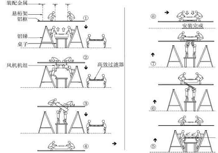 FFU安裝步驟六.在天花板上的兩位人員把FFU抬起來,潔凈室內的兩位工作人員踩著桌子把過濾器傾斜傳遞到龍骨上(高效過濾器應處在迎風面方向),由于高效過濾器的濾芯是非常脆弱、易損的,所以在安裝傳遞過程中只能握緊它的邊框,輕拿輕放,不能接觸其內部的濾芯,堅決避免碰撞濾芯。