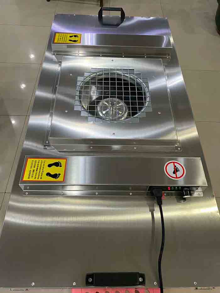 FFU層流罩設有初、高效兩級過濾裝置。風機從頂部將空氣吸入并經初效過濾器、高效過濾器進行過濾,過濾后的潔凈空氣在整個出風口送出。安裝方式有懸掛式和落地支架兩種。