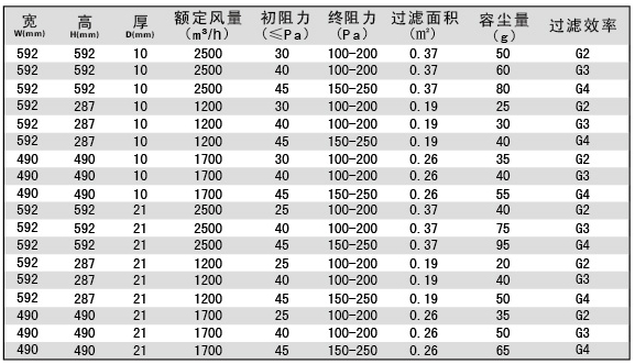 過濾效率:G1:40%@5.0μm、G2:65%@5.0μm、G3:85%@5.0μm、G4:90%@5.0μm(計重法);